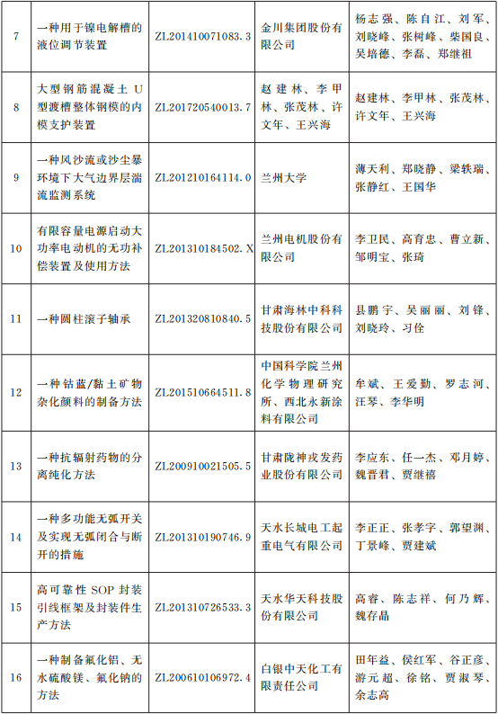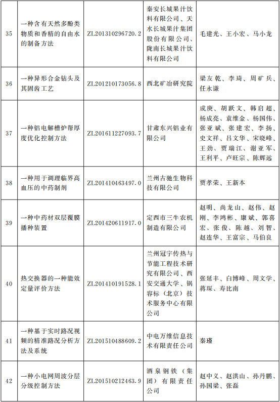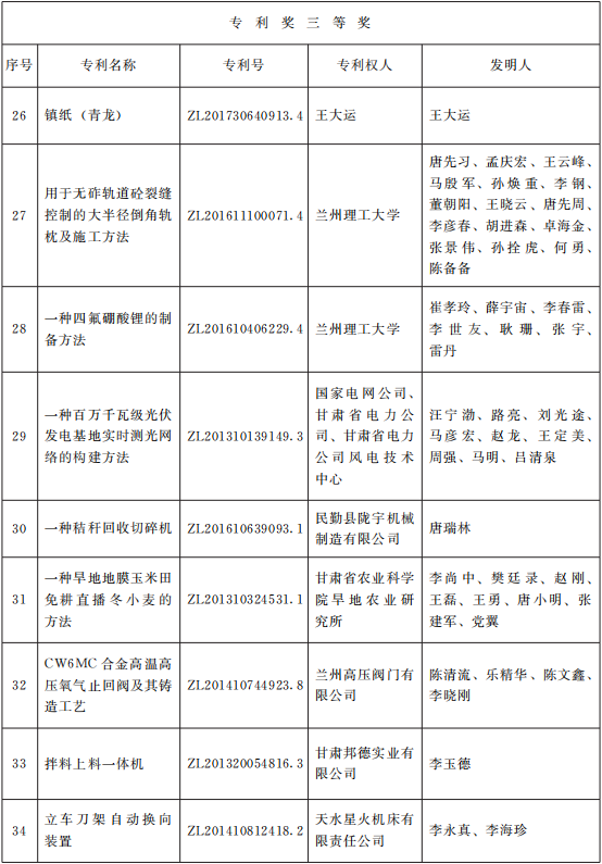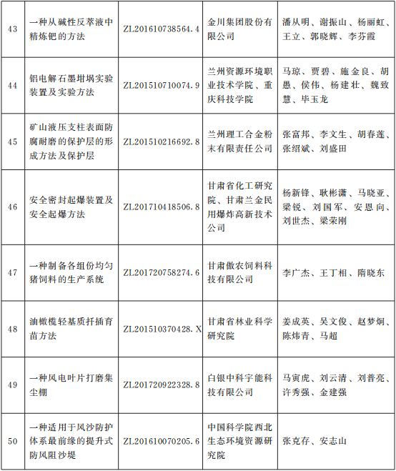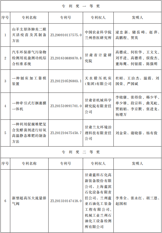 2020年度甘肅省專利獎(jiǎng)勵(lì)名單