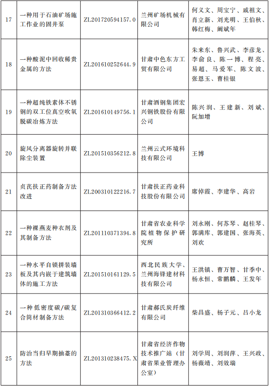 附件:2020年度甘肅省專利獎(jiǎng)勵(lì)名單