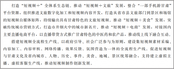 ????充分挖掘甘肅厚重的歷史文化旅游資源,在文化、旅游、民俗、美食、電商等領(lǐng)域與5G、短視頻、音頻、虛擬現(xiàn)實(shí)、在線直播等新技術(shù)業(yè)態(tài)相結(jié)合,引入短視頻服務(wù)類、音頻服務(wù)類、云服務(wù)類、電商類企業(yè),以數(shù)字內(nèi)容生產(chǎn)為抓手,打造“線上引流、線下轉(zhuǎn)型”的發(fā)展新模式,實(shí)現(xiàn)“一業(yè)帶百業(yè)”。