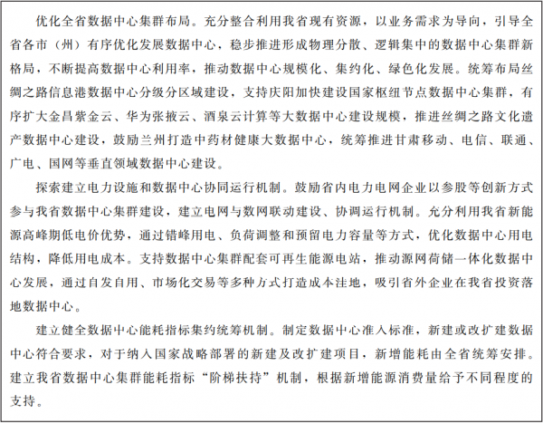 ????圍繞全國一體化算力網(wǎng)絡(luò)國家樞紐節(jié)點(diǎn)(甘肅)建設(shè),統(tǒng)籌優(yōu)化全省數(shù)據(jù)中心布局,引導(dǎo)傳統(tǒng)數(shù)據(jù)中心升級改造,向規(guī)模化、集約化、智能化、綠色化方向布局發(fā)展。探索建立電力設(shè)施和數(shù)據(jù)中心協(xié)同運(yùn)行機(jī)制、數(shù)據(jù)中心能耗指標(biāo)共享統(tǒng)籌機(jī)制。
