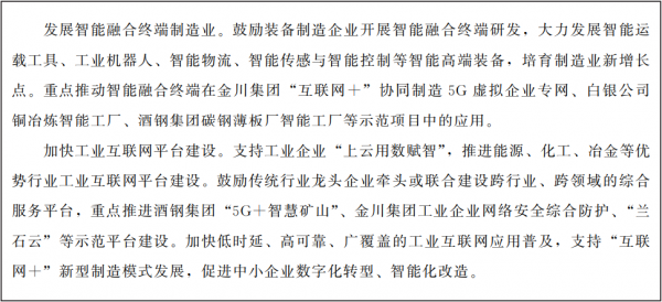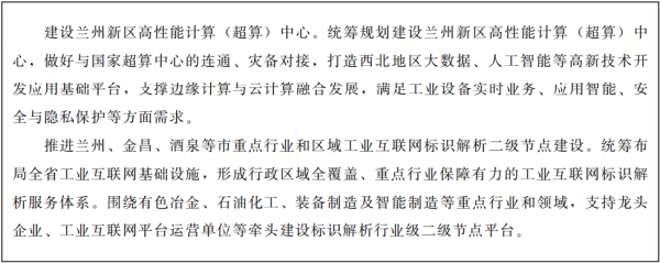 ????圍繞沿黃河流域、河西走廊、隴東南三大產(chǎn)業(yè)聚集帶的空間布局,聚焦石化、能源、冶金、裝備制造等重點(diǎn)行業(yè),打造智能制造產(chǎn)業(yè)集群,全面提升企業(yè)數(shù)字化水平,形成智能制造為驅(qū)動的新型工業(yè)體系。