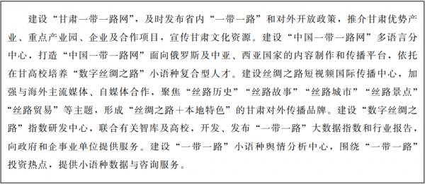 ????推進(jìn)海外數(shù)據(jù)在甘肅匯集、分析、落地應(yīng)用,加強(qiáng)同“一帶一路”沿線國家在數(shù)字化、網(wǎng)絡(luò)化、智能化方面的國際合作,促進(jìn)文化國際傳播交流,打造“數(shù)字絲綢之路”的重要門戶和核心節(jié)點(diǎn)。