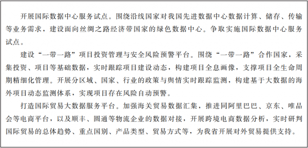 ????加強(qiáng)“一帶一路”沿線國家數(shù)據(jù)資源匯集。圍繞中西亞、南亞、中東歐等重點(diǎn)國家,通過數(shù)據(jù)共建共享機(jī)制,逐步拓展歸集海外政策法規(guī)、貿(mào)易往來、口岸通關(guān)、物流、電子商務(wù)、空間地理、科學(xué)研究、工程項(xiàng)目、合作企業(yè)、合作園區(qū)、社會輿情等數(shù)據(jù)資源,加快形成服務(wù)西北、面向海外的區(qū)域信息匯集中心。適時探索開展數(shù)據(jù)要素國際流通合作。