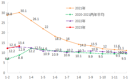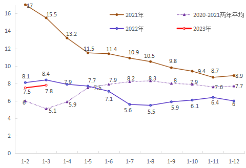 圖3??2021-2023年月度累計(jì)固定資產(chǎn)投資增速(%)