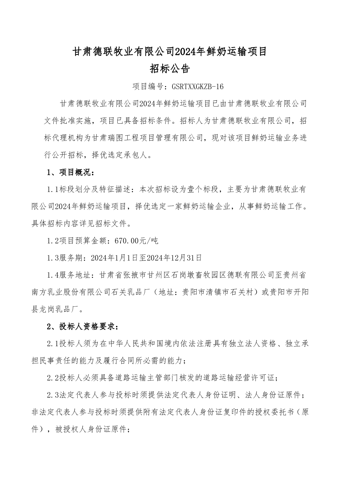 甘肅德聯(lián)牧業(yè)有限公司2024年鮮奶運(yùn)輸項(xiàng)目