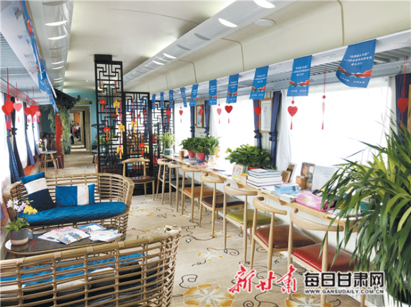 每個車廂分別以甘肅14個市州命名,在車廂兩側(cè)的玻璃車門上可以看到“酒泉館”“張掖館”“臨夏館”“甘南館”等字樣。