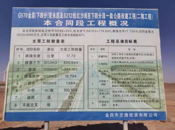 G570一級公路改建工程為《國家公路網(wǎng)規(guī)劃(2013年~2030年)》新規(guī)劃的國道。G570的建成,它既是貫通金昌與永昌之間的一條便捷通道,也是金昌市與武威市民勤縣、內(nèi)蒙自治區(qū)阿拉善右旗之間的一條重要連接線。對加快我市城鄉(xiāng)一體化進程,改善我市“一區(qū)三園”間的交通運輸狀況,促進區(qū)域經(jīng)濟社會全面發(fā)展均有著十分重要的作用。
