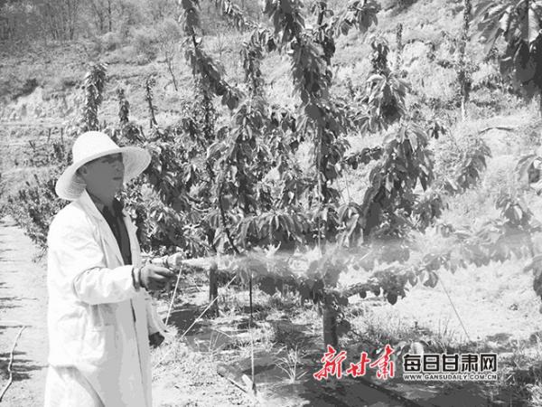 秦州區(qū)欣晟果業(yè)專業(yè)合作社的170畝櫻桃園在山腰偏上處,一串串大櫻桃綠瑩瑩的,大部分已如蠶豆般大小,合作社負(fù)責(zé)人何玉龍和工人們一道正在給每一株果樹進(jìn)行預(yù)防病蟲害追肥。
