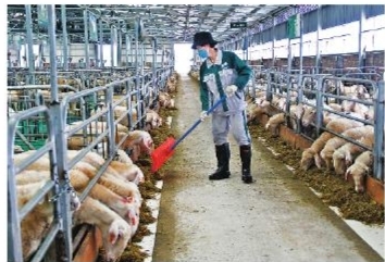 慶環(huán)肉羊制種基地工作人員在清掃羊場。隴東報記者 高于婷 攝