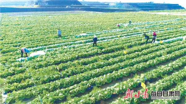 圖為臨洮縣超大智慧農(nóng)場工人采摘蔬菜。
