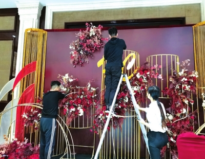 “10月份我們有131場婚禮,已經(jīng)爆單了,特別是國慶中秋假期,訂單排得滿滿當當。”9月30日,當記者聯(lián)系蘭州品尚婚企的策劃師小北時,她正驅(qū)車趕往合作酒店查看場地;雖然是工作日,依然有不少新人在店內(nèi)跟工作人員商討婚禮細節(jié)。據(jù)她介紹,受疫情影響,原計劃上半年舉辦婚禮的新人選擇了延期,其中不少訂單延期到了10月份。國慶中秋假期,公司要布置近72場婚禮,這幾個月加班出方案、布場都是常事,有時都會忙一整個通宵。
