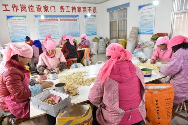 鎮(zhèn)原縣太平鎮(zhèn)棗林村扶貧車間群眾忙碌著揀杏仁。新甘肅·甘肅日?qǐng)?bào)通訊員 曹延延攝