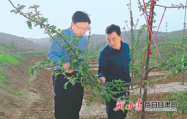 馬立強(qiáng)(右)督查春季蘋果園管理情況。