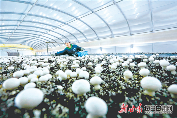 近年來,食用菌產(chǎn)業(yè)在甘州區(qū)發(fā)展起來。圖為工人在采摘食用菌。