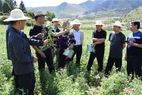 此次現(xiàn)場觀摩會由省作物學(xué)會組織,甘肅農(nóng)業(yè)大學(xué)、省農(nóng)技推廣總站、省種子管理總站等有關(guān)單位專家組成田間測評專家組,對甘肅省農(nóng)業(yè)科學(xué)院作物研究所承擔(dān)并完成的“甘肅高海拔寒區(qū)豌豆新品種篩選及示范”項(xiàng)目進(jìn)行田間測評。測評專家組通過對8個(gè)不同生長特性豌豆品種田間群體結(jié)構(gòu)、豐產(chǎn)性、抗病性等農(nóng)藝性狀的綜合研判,評價(jià)出高抗白粉病、矮桿抗倒、鮮莢肥厚的菜用型豌豆品種隴豌5號和糧飼兼用型豌豆品種隴豌6號。專家組還對隴豌6號百畝示范田進(jìn)行了現(xiàn)場取樣測產(chǎn),測得該品種平均畝產(chǎn)達(dá)214公斤,抗白粉病、抗根腐病、早熟、耐陰、花期集中、矮桿抗倒、綜合農(nóng)藝性狀優(yōu)良。專家組認(rèn)為,將其大面積推廣和應(yīng)用,可有效解決我省高海拔寒區(qū)早熟豌豆品種缺乏的問題。