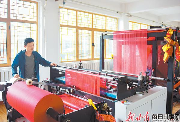吹膜、印刷、切袋、打包……記者來到卓尼縣軍騰文體商貿(mào)有限責(zé)任公司生產(chǎn)車間,一臺臺生產(chǎn)機(jī)器正不停運(yùn)轉(zhuǎn),工人們緊張有序地制作著無紡布環(huán)保購物袋、可降解塑料替代產(chǎn)品,現(xiàn)場一派繁忙景象。