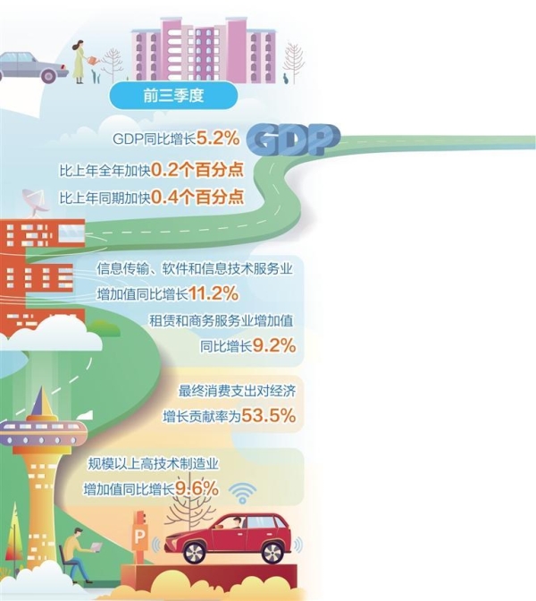 從經(jīng)濟(jì)增長看,前三季度,GDP同比增長5.2%,比上年全年和上年同期分別加快0.2個(gè)、0.4個(gè)百分點(diǎn);經(jīng)濟(jì)增量達(dá)到39679億元,同比多增1368億元。