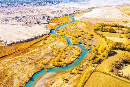 胡楊林點(diǎn)染疏勒河。(通訊員王亞虎)