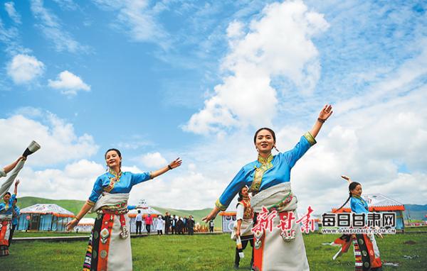 藍(lán)天悠悠,白云舒卷游走;牧草青青,風(fēng)吹草低見牛羊。悠然怡人的甘南美景讓人沉醉。無(wú)人機(jī)航拍鏡頭下,尕秀村帳篷城108頂大小各異的帳篷如同一顆顆璀璨的珍珠,組成了蓮花圖案,鑲嵌在秀美的草原上。品藏餐、唱藏歌、跳鍋莊,游客和牧民親切互動(dòng),帳篷內(nèi)外也是好生熱鬧……