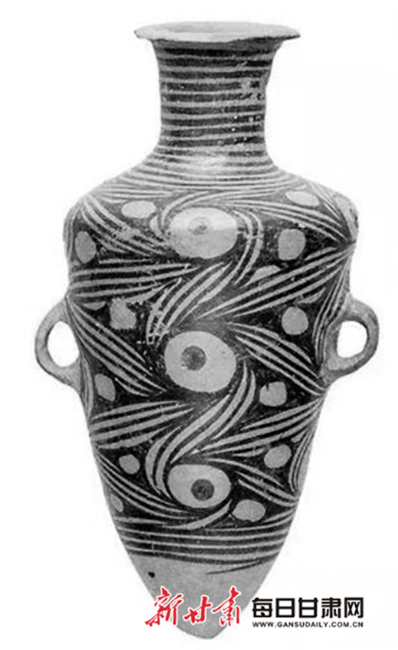 這是距今約4800年的馬家窯文化馬家窯類型尖底瓶。1971年在隴西縣首陽公社呂家坪出土,泥質(zhì)橙黃陶,侈口,翻沿,細(xì)頸,折肩,腹部下收成尖底,腹部有系繩用的半圓雙耳。施黑彩,頸部繪平行弦紋,肩部以下繪三組連續(xù)旋渦紋。