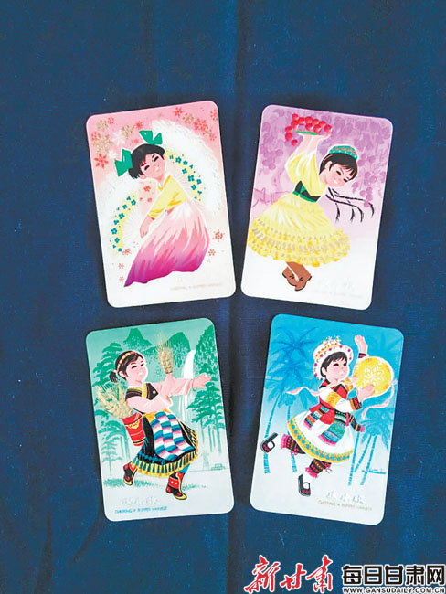 上世紀70年代,國家把進出口公司產(chǎn)品當作“拳頭”產(chǎn)品,為國家換取外匯。甘肅省也和其他省份一樣,作了積極的努力,省進出口公司于1976年制作了四枚一套的《慶豐收》年歷片,以漢族、維吾爾族、藏族、壯族少女為圖案,表現(xiàn)了良好的藝術(shù)創(chuàng)作風格。