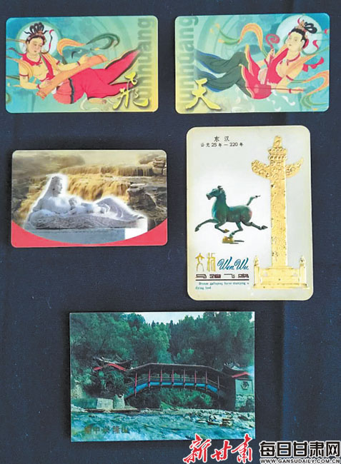 甘肅的自然風光優(yōu)美,人文歷史悠久,經(jīng)過不斷挖掘,精心保護,成為人們旅游、觀光的理想之地。北京中鈔信用卡廠于2001年制作的“飛”字片、“天”字片“飛天”對卡年歷片,中國工商銀行甘肅分行于2000年設(shè)計了《黃河母親》年歷片,中國農(nóng)業(yè)銀行甘肅分行于1987年設(shè)計的《興隆山握橋風光》年歷片,中國遠洋運輸公司上海分公司于1978年制作的《馬踏飛鳥》年歷片,都為甘肅旅游風光作了宣傳。