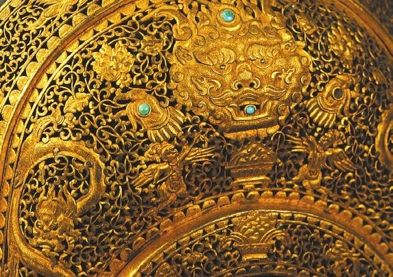 有,甚至可以比我們想象的還要華麗。且看甘肅省博物館收藏的清代“鎏金刻紋馬鞍”,看到這只馬鞍的華貴造型、精湛工藝,你就知道僅僅用“金雕鞍”這個詞來描述都算是詞窮了。甘博的這只馬鞍是真正的金雕鞍,主體自然是木質(zhì),可前后橋及外露的護板上鑲嵌著鎏金的銀飾,鏤刻著精美的云龍花草圖案,龍額龍口等地方甚至鑲嵌著綠松石。這只馬鞍如此的精細優(yōu)美,真讓人嘆為觀止!(本文撰文·陳芊 供圖·甘肅省博物館 )