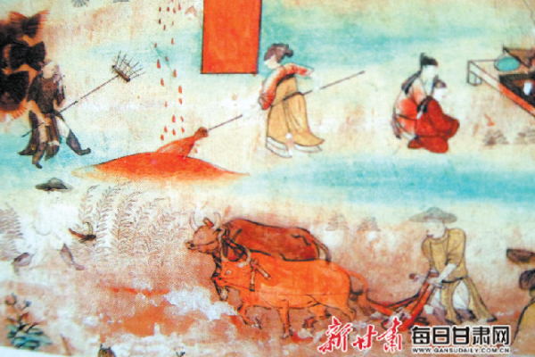 例如,敦煌壁畫中約有80多幅農(nóng)作圖,涉及北朝至西夏近1000年間的各個時代。有犁耕、牽牛、播種、耙地、耱地、揚糞土、鋤草、收割、捆田、人工挑運、打場、揚場、糧食裝袋、牛車?yán)\、歸倉、舂谷、脫粒等。畫面中出現(xiàn)了數(shù)十種生產(chǎn)工具,如耕犁(單轅直轅犁、雙轅直轅犁、曲轅犁)、三角耬、鐵鏵、牛衡、籽種籃、耱、耙、鋤、镢、鐵鍬、木锨、鐮、杈、扁擔(dān)、石磨、手搖磨、足踏碓、簸箕、連枷、秤、斛、木斗、升子、糧袋、牛車等。還有畜牧養(yǎng)殖、花草樹木種植與栽培等場景。這些形象資料全面而真實地反映和記錄了我國古代特別是北方地區(qū)農(nóng)業(yè)生產(chǎn)活動的情況,是我們了解古代農(nóng)業(yè)生產(chǎn)客觀而珍貴的資料。