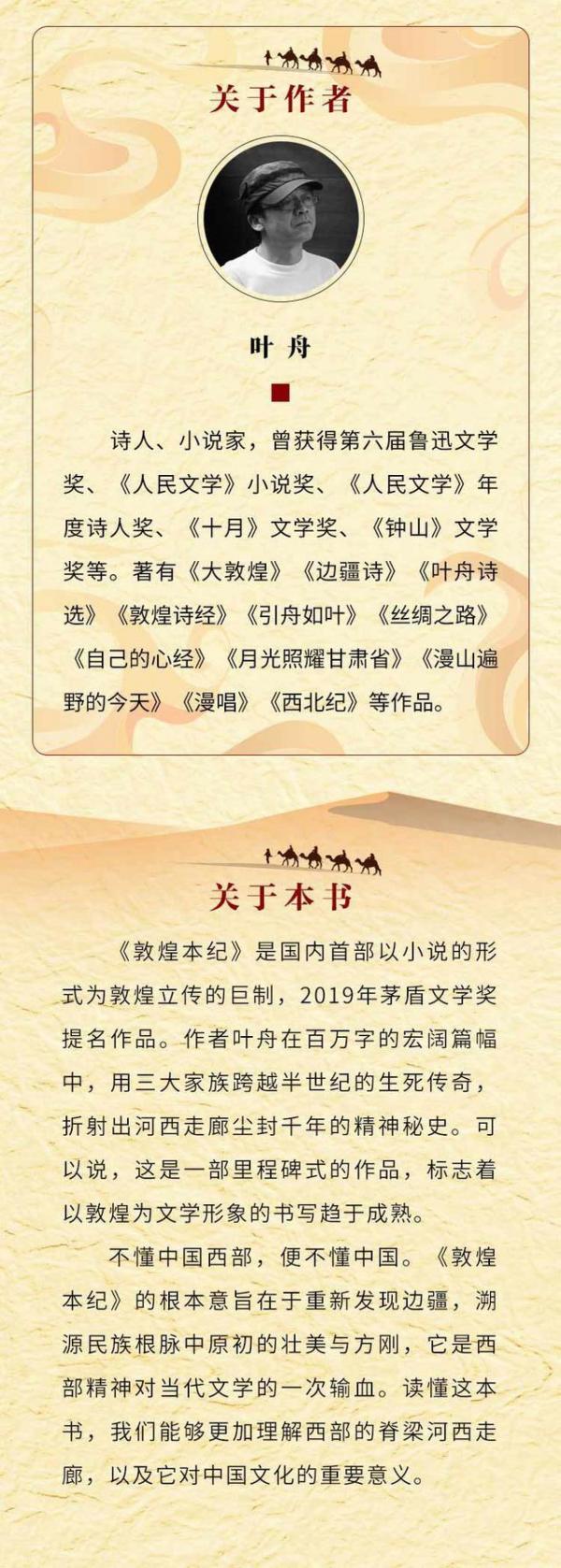 2019年8月公布的第十屆茅盾文學(xué)獎十部提名作品中,有一部著作以109萬字的篇幅,探尋古老的敦煌從哪里來,又將往何處去。它就是《敦煌本紀(jì)》。這是國內(nèi)首部以小說筆法為敦煌立傳的長篇巨制,作者葉舟以三大家族跨越半世紀(jì)的命運沉浮,重述河西走廊塵封千年的精神秘史。河西走廊有了這部《敦煌本紀(jì)》,正如關(guān)中平原有一部《白鹿原》。