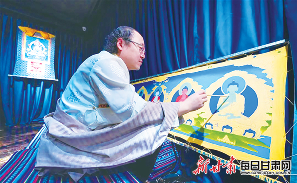 唐卡是藏族文化中一種獨(dú)具特色的繪畫藝術(shù)形式,也叫唐嘎、唐喀,系藏文音譯?!疤瓶ā币辉~中的“唐”和空間有關(guān),意味著廣袤無邊,就像在一塊布上勾勒出幾百甚至上千尊佛,“卡”指的是填補(bǔ)畫布上的空白。因?yàn)樘瓶芡暾孛枥L出一座寺院,加之可隨意移動(dòng),方便牧民們收藏,故被稱作移動(dòng)的廟宇。天祝縣也是唐卡藝術(shù)傳播最為集中的地區(qū)之一。