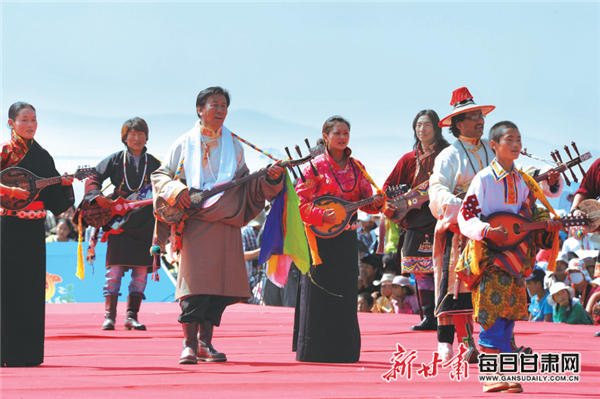 龍頭琴?gòu)棾l(fā)源于瑪曲縣,是我省特有的少數(shù)民族曲藝形式。龍頭琴因演奏樂器的琴頭被雕成龍首形狀而得名,由藝人自彈自唱、即興填詞,是集唱、彈、舞于一體的綜合性曲藝表演形式。龍頭琴?gòu)棾袉螜n、雙檔、多檔,男女對(duì)唱、馬背彈唱、組合彈唱、百人千人彈唱等多種表演形式。
