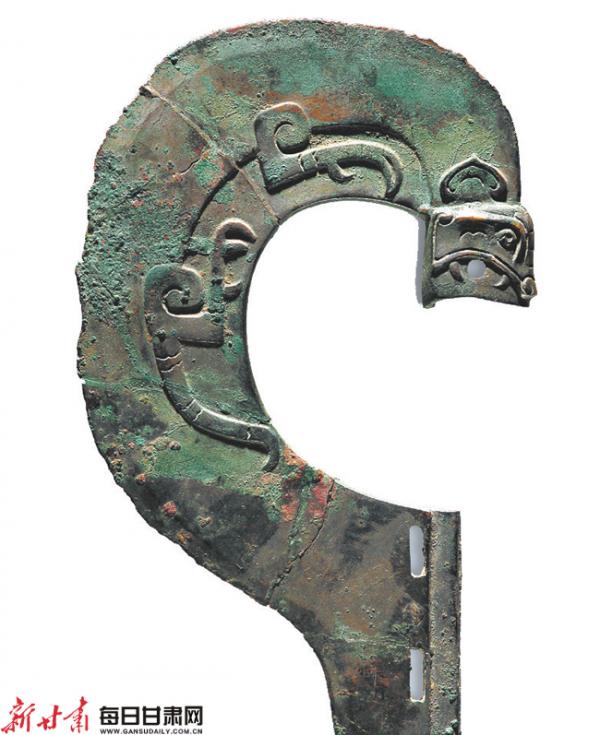 鉞發(fā)端于新石器時期,夏商時期尤其是在商代達(dá)到頂峰,可西周早中期,青銅鉞就已經(jīng)開始衰落了。周代大銅鉞的數(shù)量已經(jīng)很少,鉞的樣子也發(fā)生了變化,出現(xiàn)了一種形狀似環(huán)形的異形鉞,又稱耳形鉞或扇形鉞,這種鉞以銎(qióng)裝柄,外形與人耳相似。甘肅省博物館收藏的、出土于靈臺縣白草坡西周墓的“虎紋銅鉞”就是典型的西周耳形鉞。這件銅鉞身似半環(huán)形,鉞身飾虎紋,銎為虎頭,心形耳,虎口為銎口,張口露齒。虎身彎曲做伏臥狀,虎爪內(nèi)鉤,虎尾上卷。比起商代的青銅鉞,這件西周“虎紋銅鉞”整體造型要靈動得多,但明顯少了商代青銅鉞的威猛和霸氣。