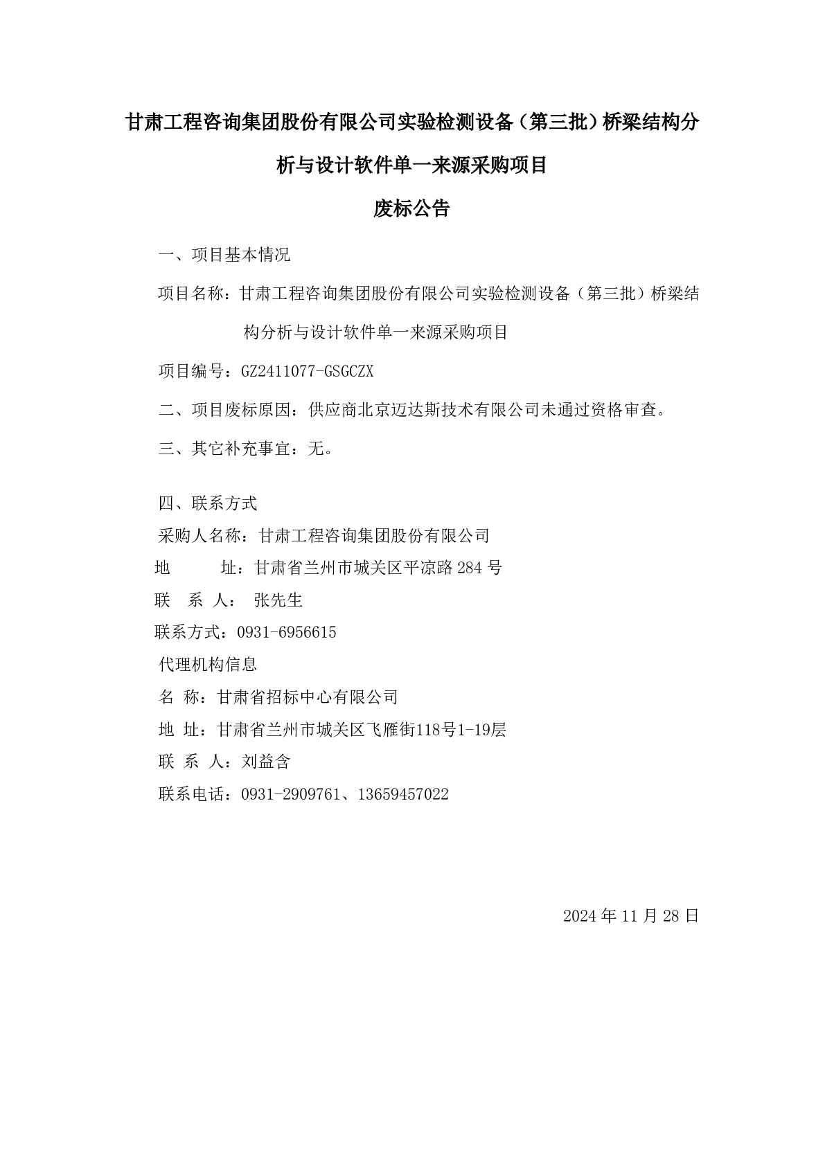 甘肅工程咨詢集團股份有限公司實驗檢測設備(第三批)橋梁結構分 析與設計軟件單一來源采購項目 廢標公告