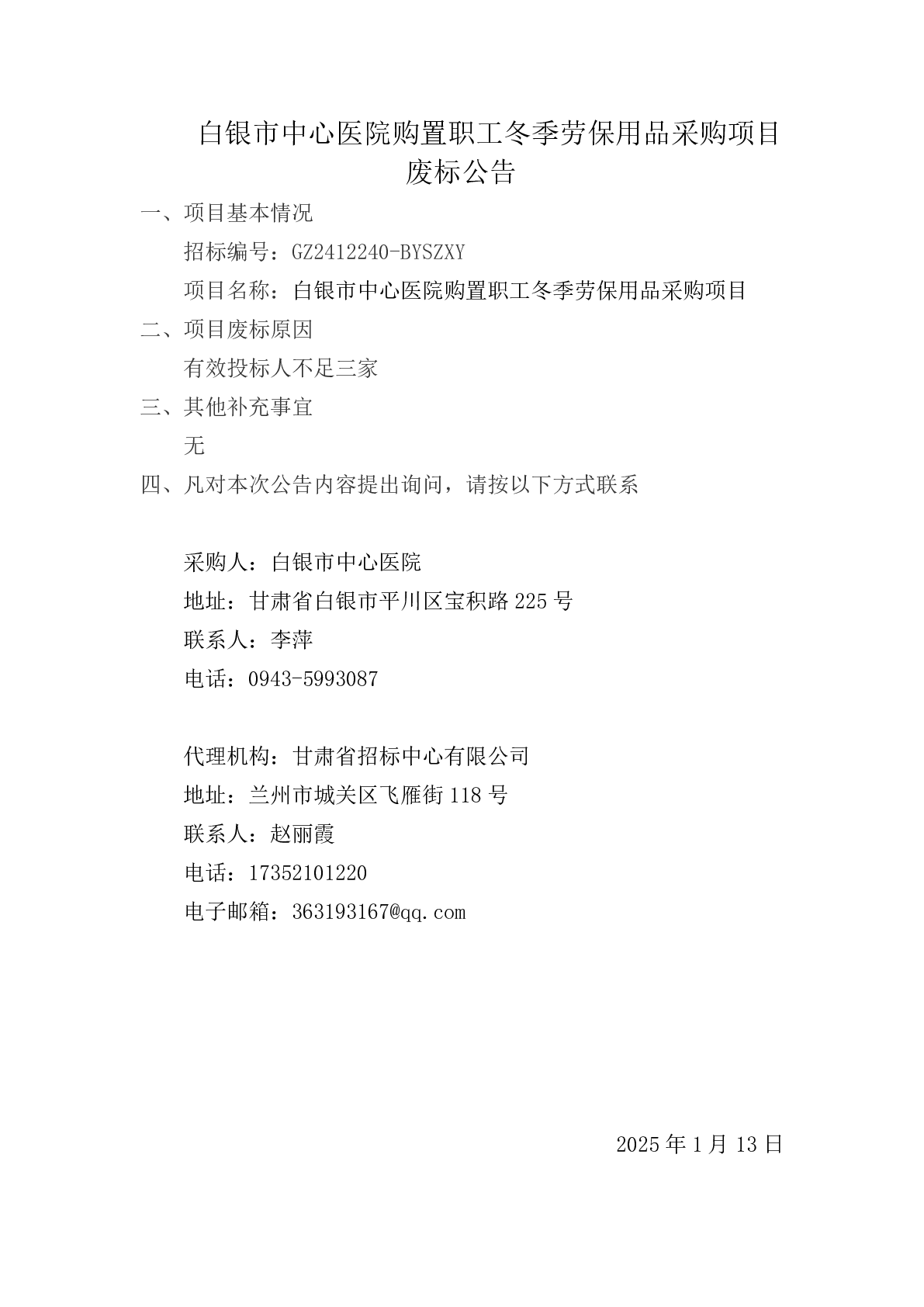 白銀市中心醫(yī)院購置職工冬季勞保用品采購項(xiàng)目 廢標(biāo)公告