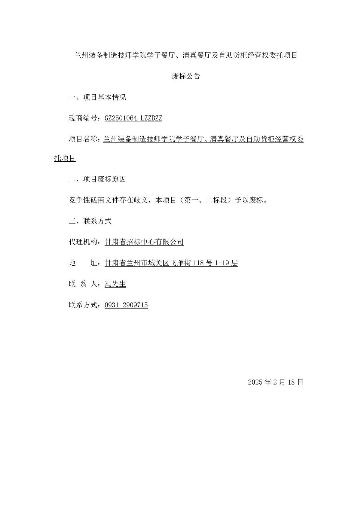 蘭州裝備制造技師學院學子餐廳、清真餐廳及自助貨柜經(jīng)營權委托項目 廢標公告