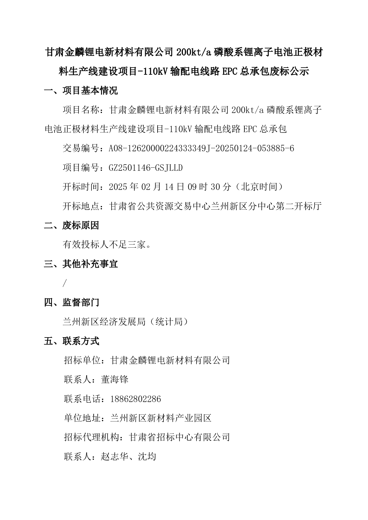 甘肅金麟鋰電新材料有限公司 200kt/a 磷酸系鋰離子電池正極材 料生產(chǎn)線建設(shè)項(xiàng)目-110kV 輸配電線路 EPC 總承包廢標(biāo)公示