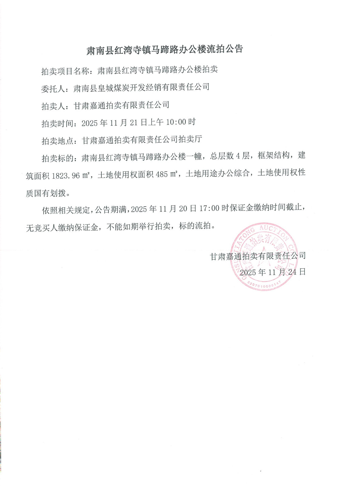 肅南裕固族自治縣紅灣寺鎮(zhèn)馬蹄路辦公樓流拍公告