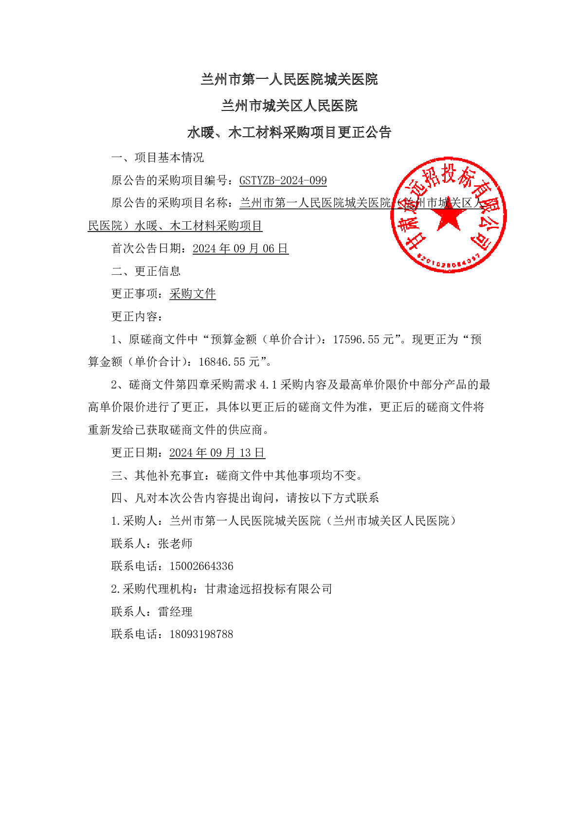 蘭州市第一人民醫(yī)院城關(guān)醫(yī)院(蘭州市城關(guān)區(qū)人民醫(yī)院)水暖、木工材料采購項(xiàng)目更正公告