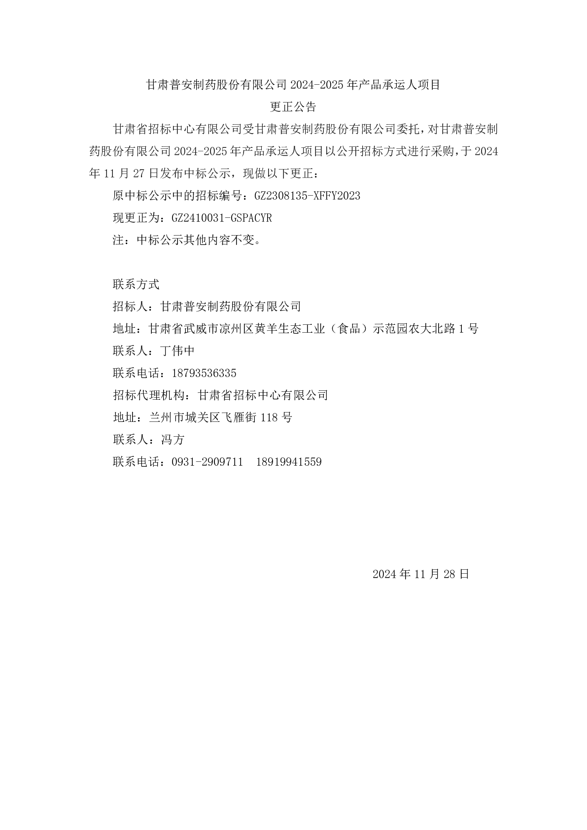 甘肅普安制藥股份有限公司 2024-2025 年產(chǎn)品承運人項目 更正公告