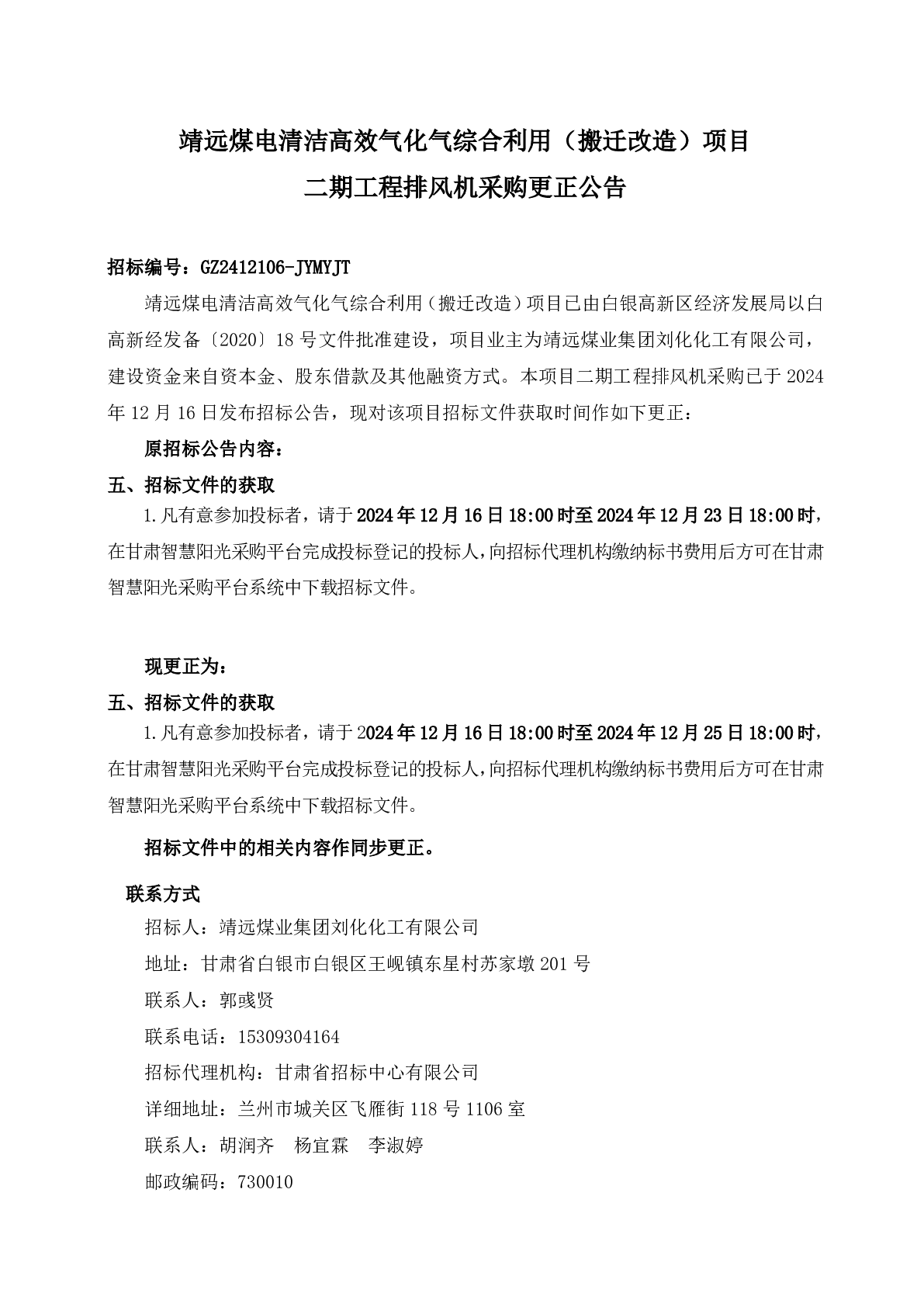 靖遠(yuǎn)煤電清潔高效氣化氣綜合利用(搬遷改造)項(xiàng)目 二期工程排風(fēng)機(jī)采購更正公告