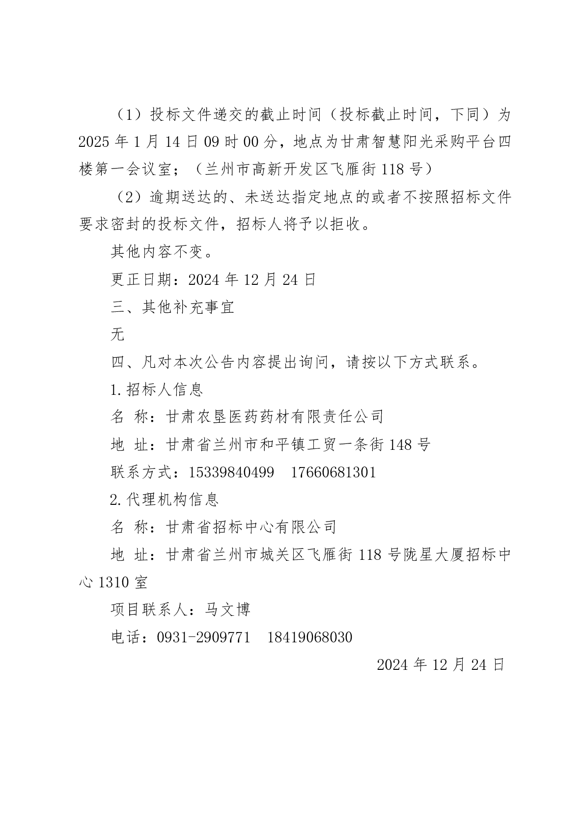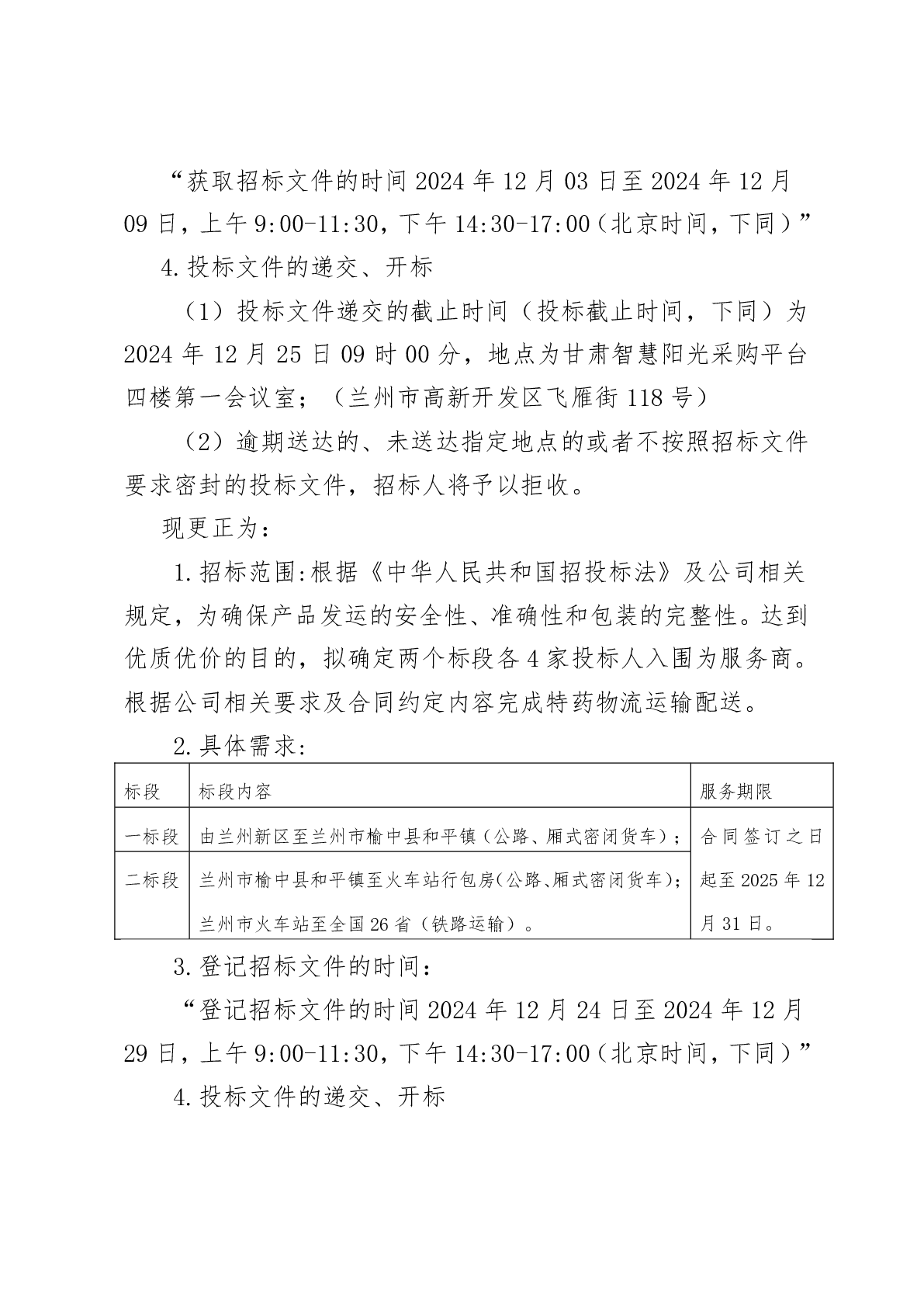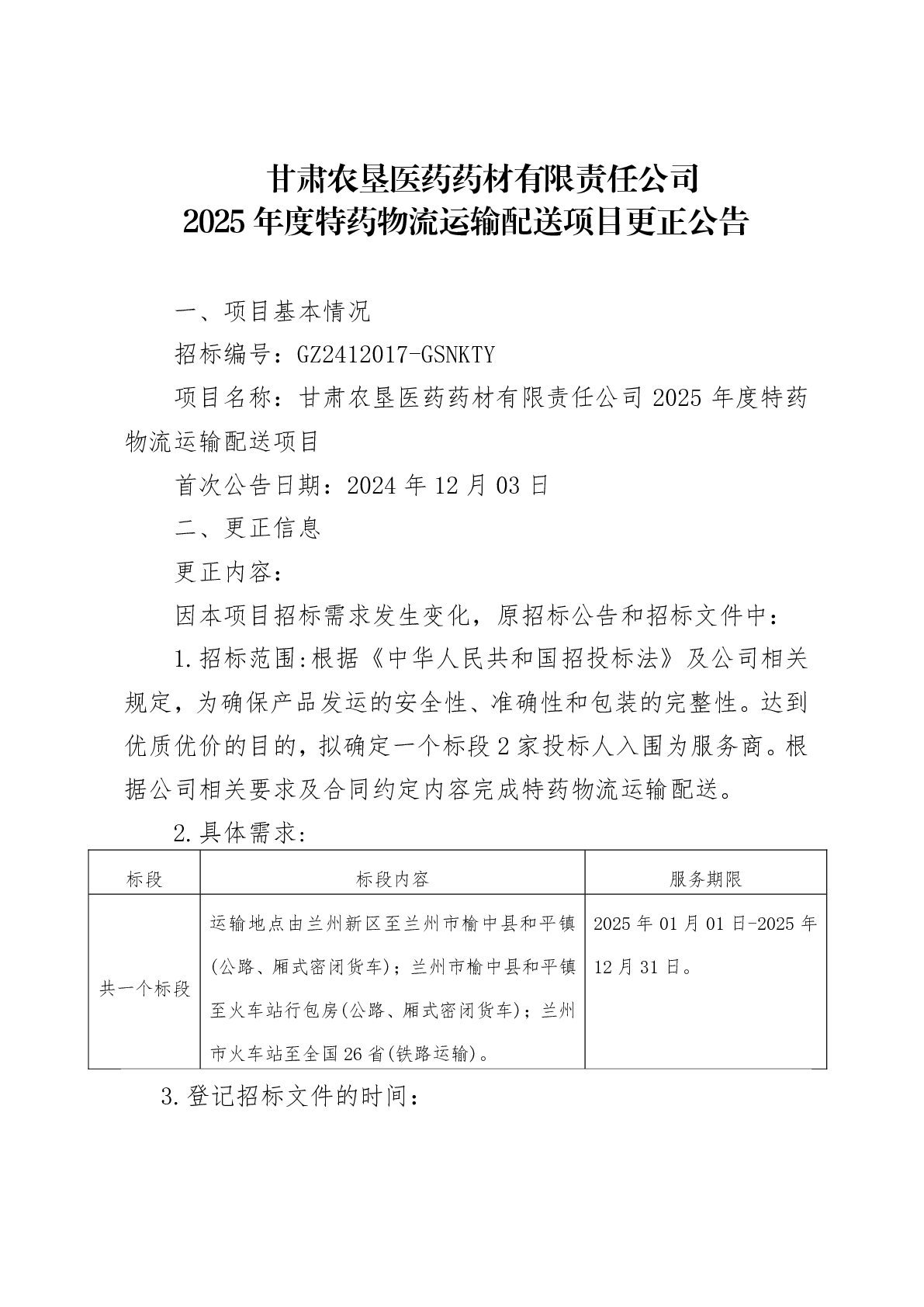 甘肅農(nóng)墾醫(yī)藥藥材有限責(zé)任公司 2025 年度特藥物流運(yùn)輸配送項(xiàng)目更正公告