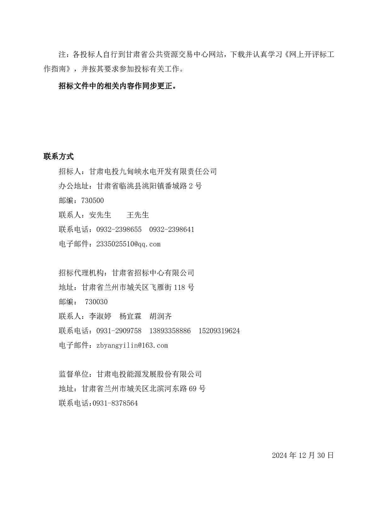 甘肅電投九甸峽水電開發(fā)有限責任公司 職工食堂勞務外包服務項目更正公告