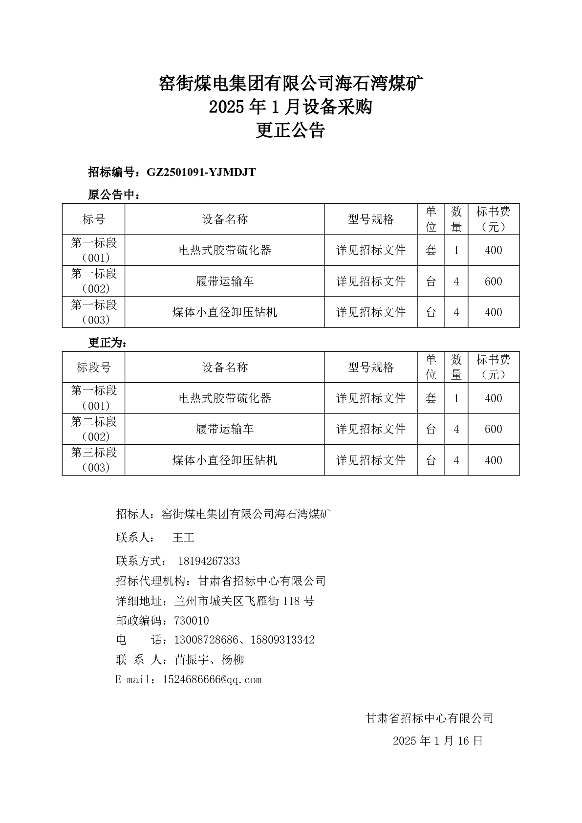 窯街煤電集團有限公司海石灣煤礦2025 年 1 月設備采購更正公告