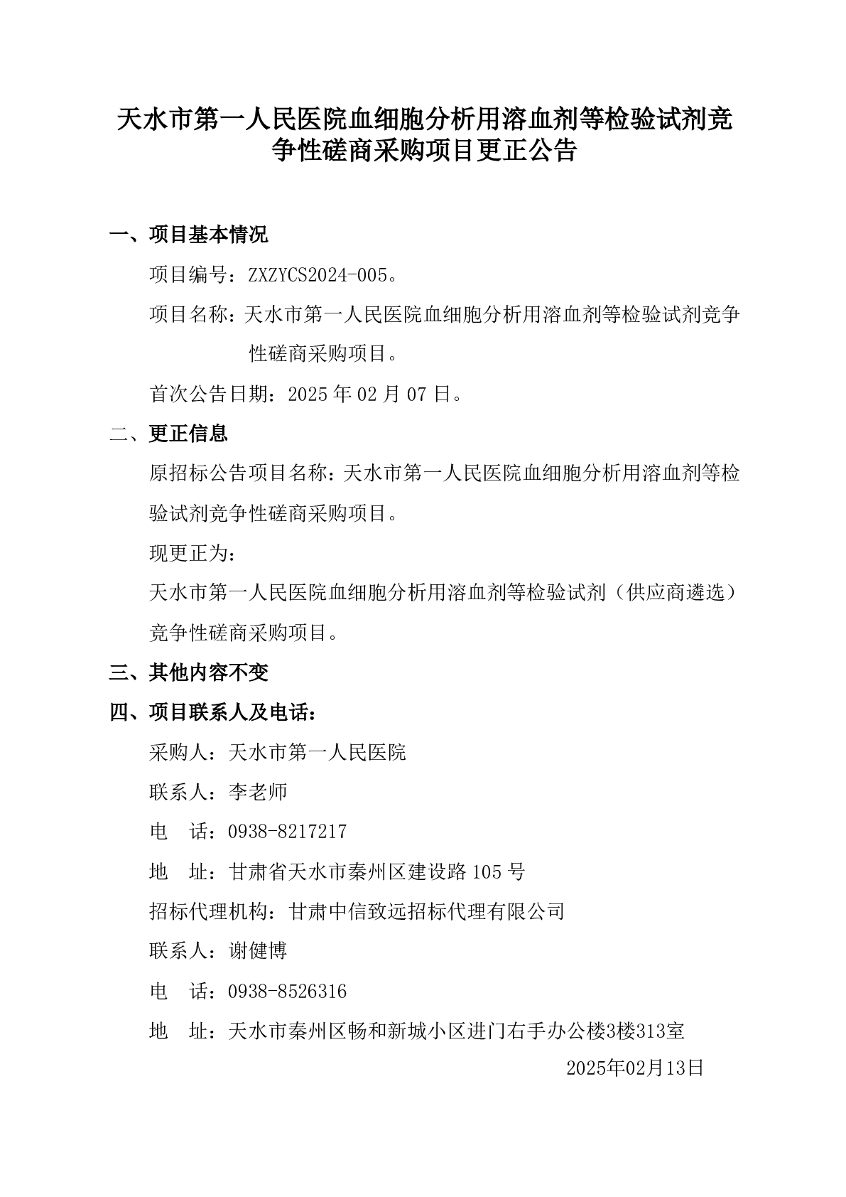 天水市第一人民醫(yī)院血細(xì)胞分析用溶血?jiǎng)┑葯z驗(yàn)試劑競(jìng)爭(zhēng)性磋商采購(gòu)項(xiàng)目更正公告