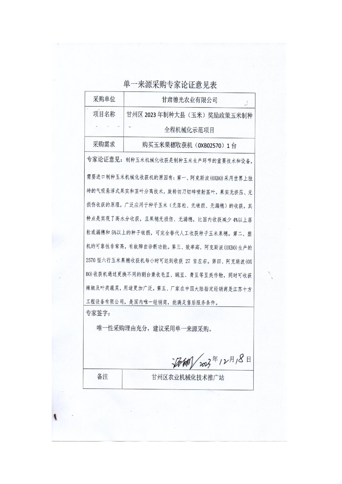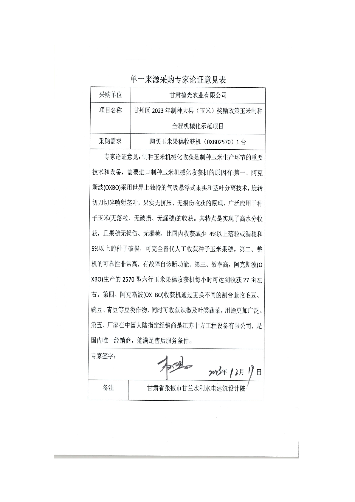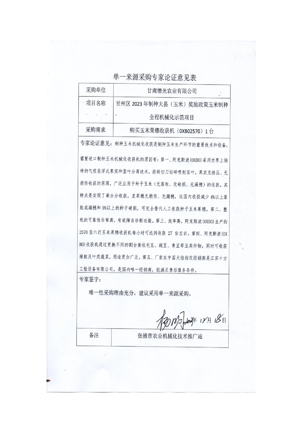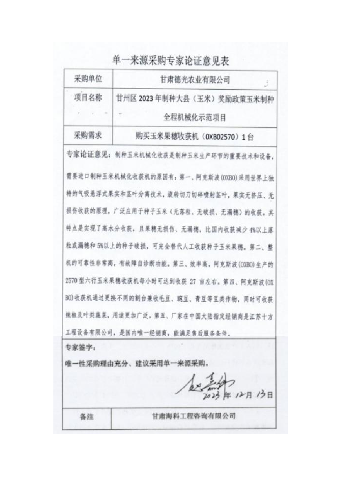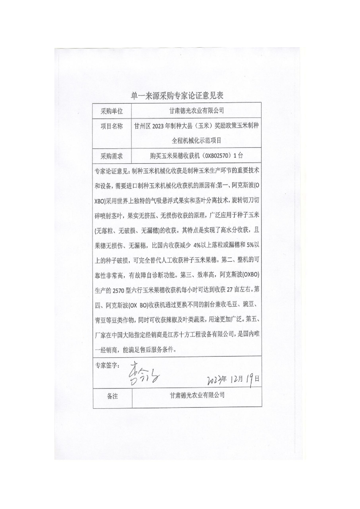 甘州區(qū)2023年制種大縣(玉米)獎勵政策玉米制種全程機械化示范項目單一來源采購論證公示