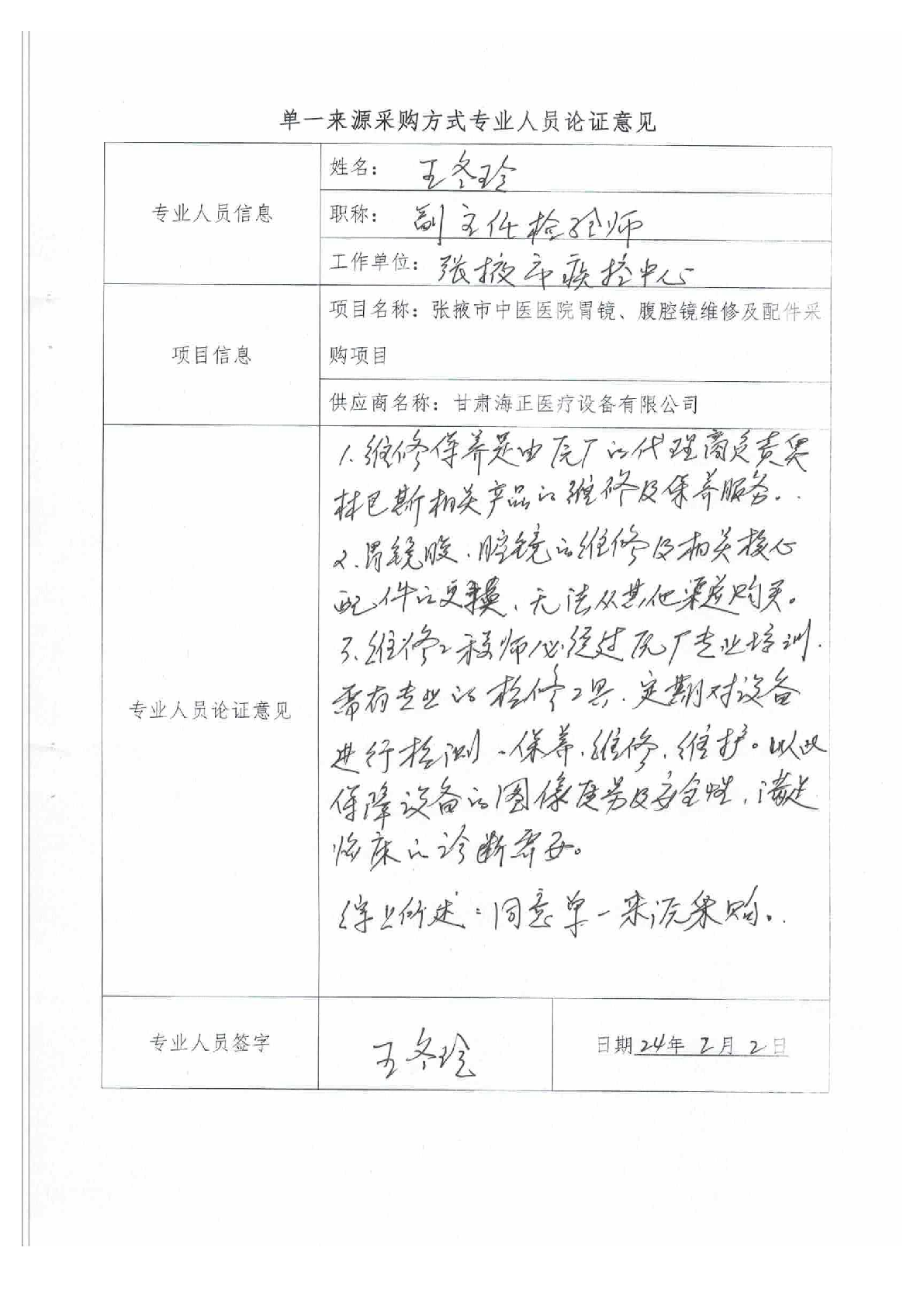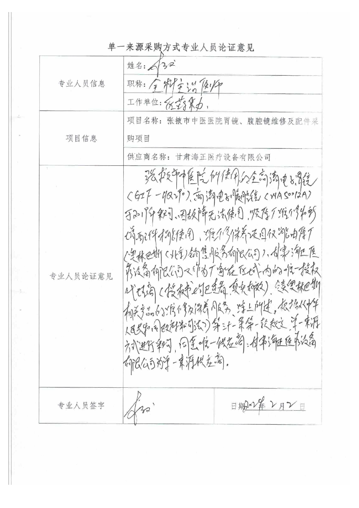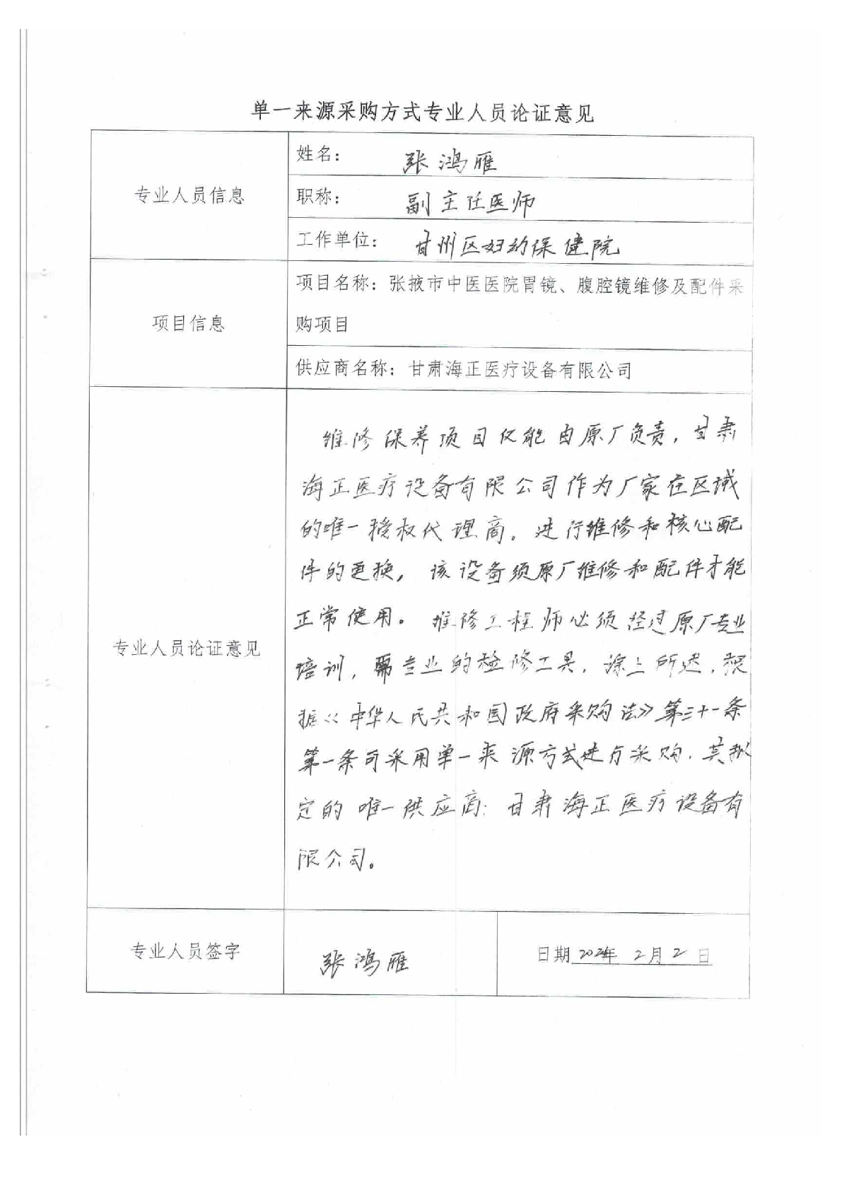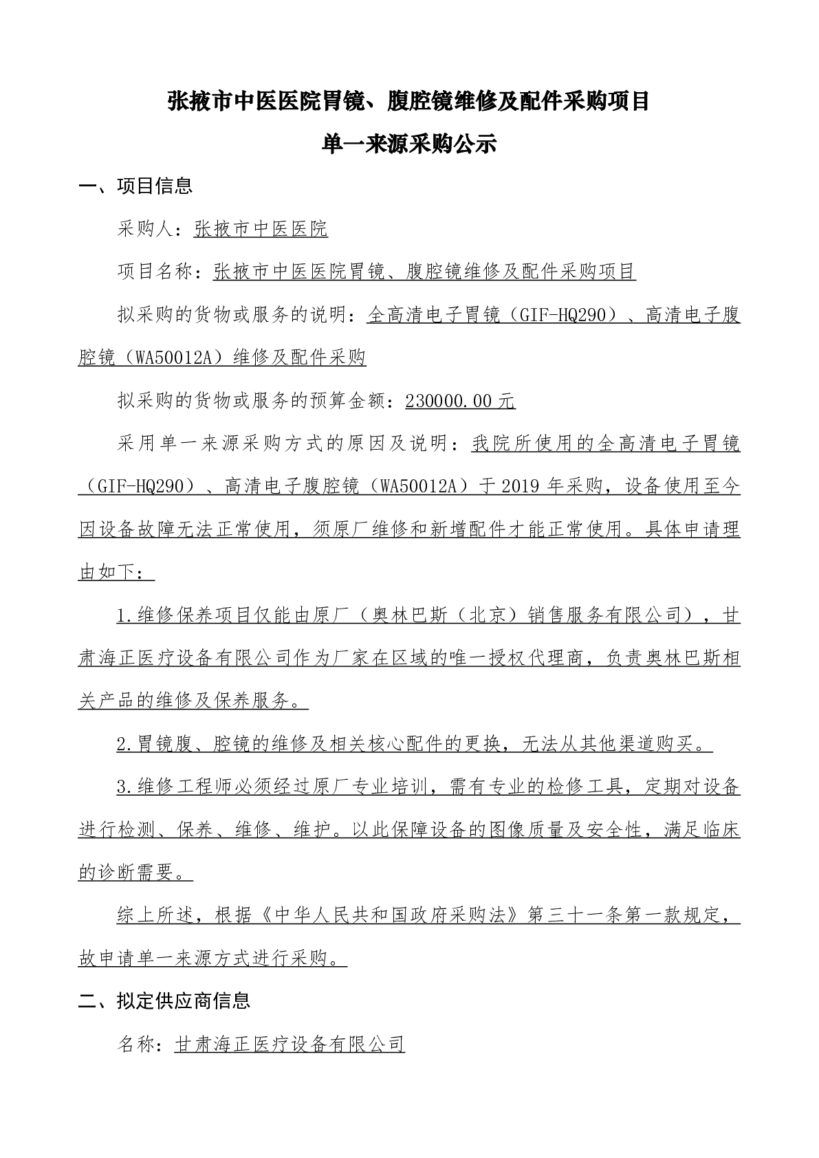張掖市中醫(yī)醫(yī)院胃鏡、腹腔鏡維修及配件采購項目單一來源采購公示