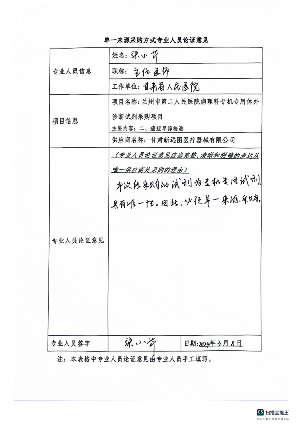 采用單一來源采購方式的原因及說明:我院在檢測時為保證診斷結(jié)果及時、準確、可靠,且根據(jù)相關(guān)技術(shù)規(guī)范和操作規(guī)程,要求專用檢驗試劑及耗材的質(zhì)量穩(wěn)定,檢測靈敏度高,必須使用與儀器相匹配的專機專用試劑盒。故依據(jù)《中華人民共和國政府采購法》第三十一條第三款規(guī)定,我院擬采用單一來源方式對本項目進行采購。