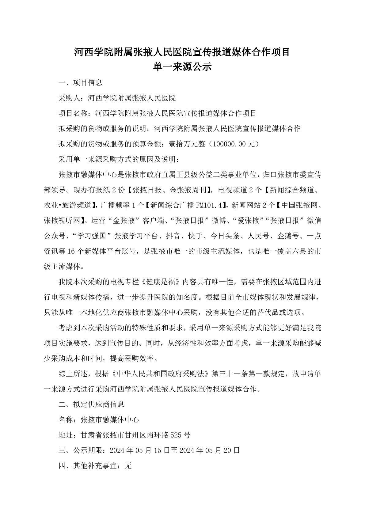 河西學(xué)院附屬張掖人民醫(yī)院宣傳報(bào)道媒體合作項(xiàng)目單一來源公示