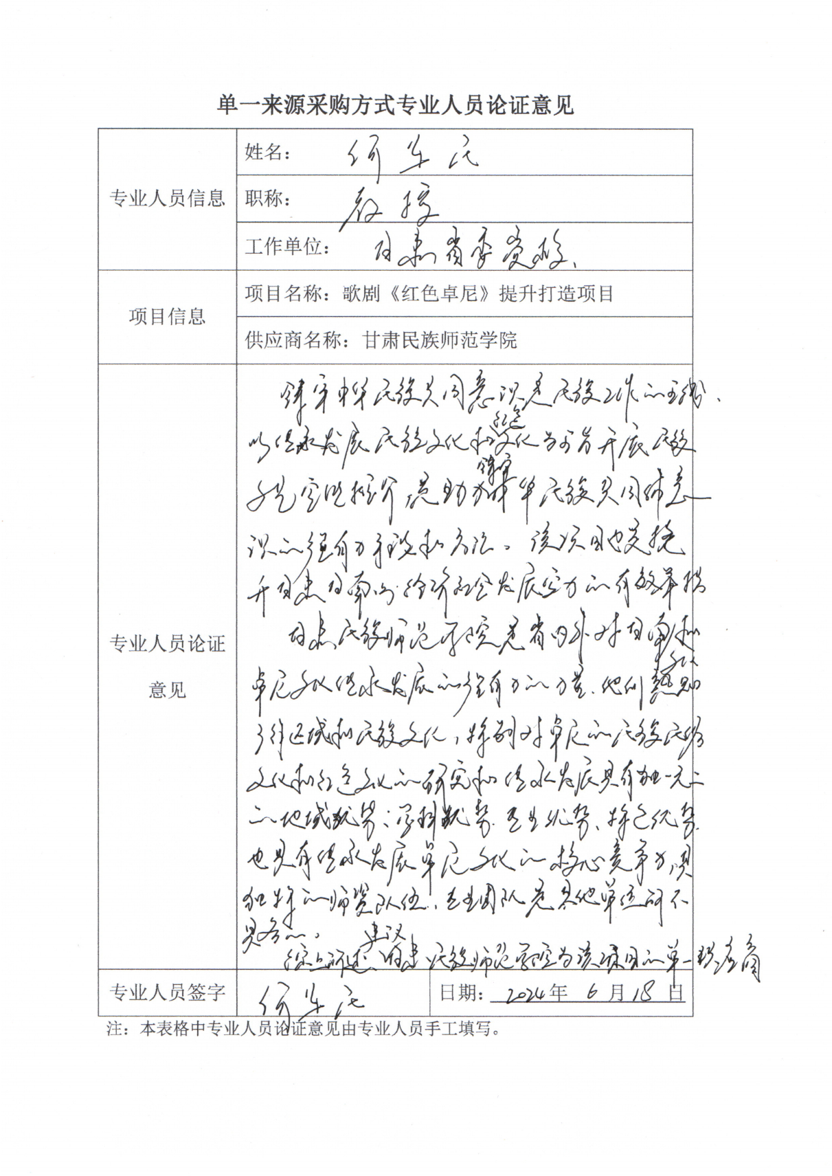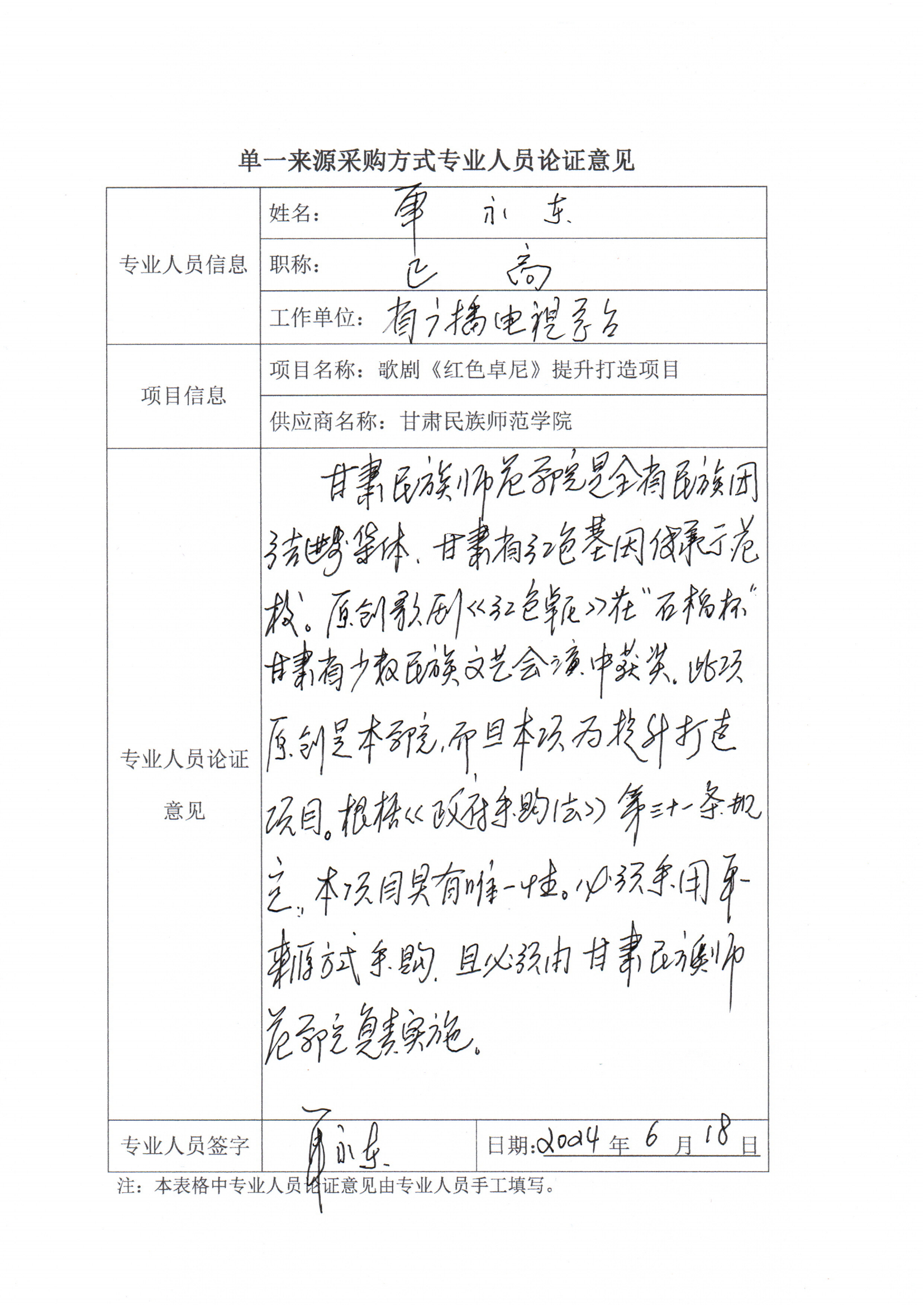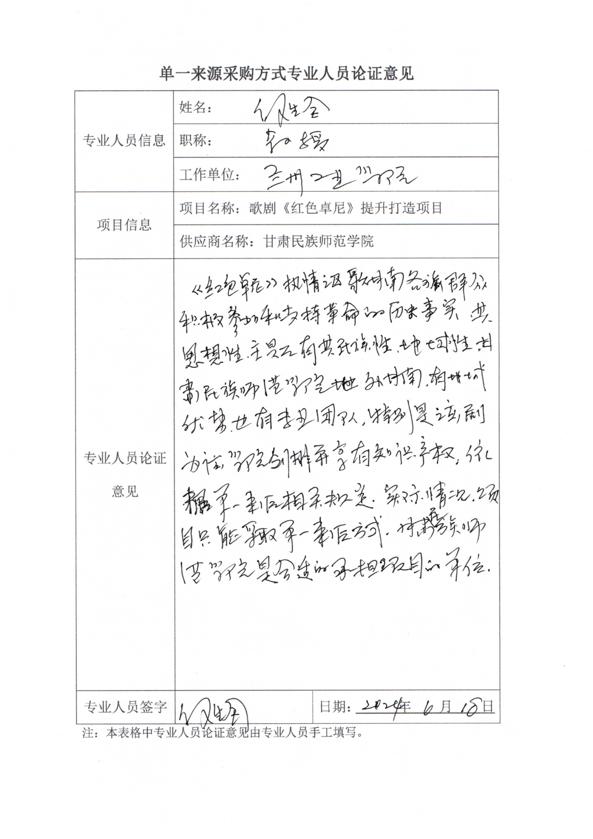 ? ? ? ?采用單一來源采購方式的原因及說明:歌劇《紅色卓尼》是我省民族歌劇創(chuàng)作的優(yōu)秀成果,在民族文化傳承和傳播中具有較高的影響力和知名度,該劇由甘肅民族師范學(xué)院獨家創(chuàng)排并享有知識產(chǎn)權(quán),且具備原創(chuàng)性、唯一性和獨特性,鑒于以上原因,根據(jù)《中華人民共和國政府采購法》第三十一條規(guī)定,擬采用單一來源方式采購。