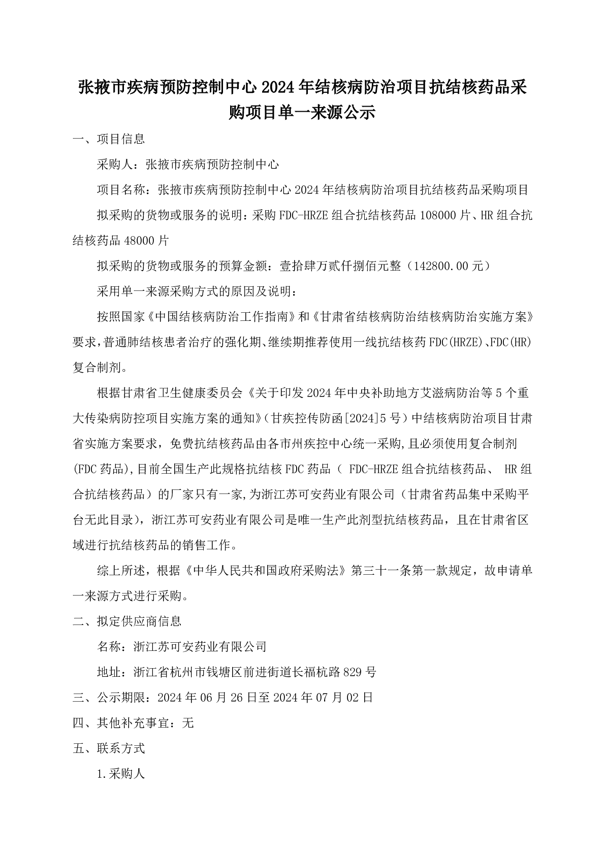 張掖市疾病預(yù)防控制中心2024年結(jié)核病防治項目抗結(jié)核藥品采購項目單一來源公示